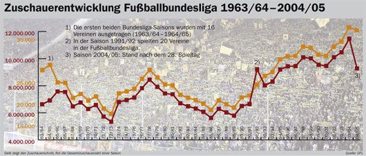 Zuschauerentwicklung Fußballbundesliga 1963/64 – 2004/05 Faszination Fankurve 01.05.2005 0 Kommentare Foto: Faszination Fankurve