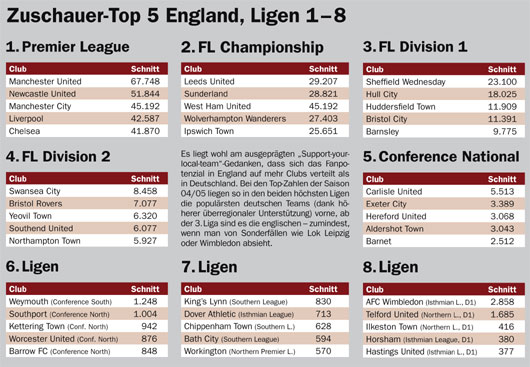 Es liegt wohl am ausgeprägten „Support-yourlocal- team“-Gedanken, dass sich das Fanpotenzial in England auf mehr Clubs verteilt als in Deutschland. Bei den Top-Zahlen der Saison 04/05 liegen so in den beiden höchsten Ligen die populärsten deutschen Teams (dank höherer überregionaler Unterstützung) vorne, ab der 3. Liga sind es die englischen – zumindest, wenn man von Sonderfällen wie Lok Leipzig oder Wimbledon absieht.