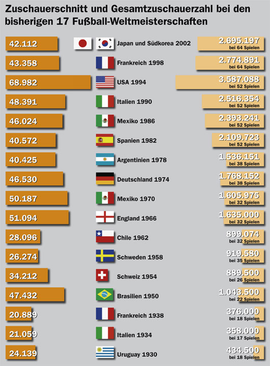Zuschauerschnitt und Gesamtzuschauerzahl bei den bisherigen 17 Fußball-Weltmeisterschaften Faszination Fankurve 01.10.2005 0 Kommentare Foto: Faszination Fankurve