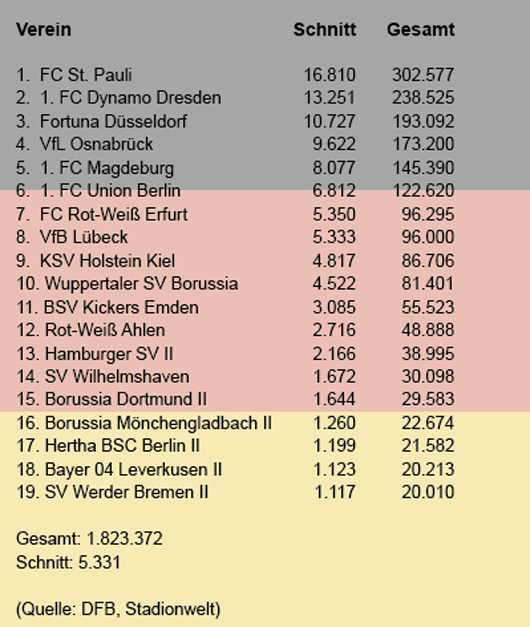 Zum Zweitligaaufsteiger Sankt Pauli strömten in der abgelaufenen Saison 16.810 Zuschauer. Das ist in etwa das Fünfzehnfache der Menge, die sich bei den Heimspielen von Werder Bremen auf Platz 11 des Westestadions einfand. Rechnet man das auf die Bundesliga um, hätte Borussia Dortmund einen Schnitt von über 240.000 im Vergleich zu Energie Cottbus haben müssen.