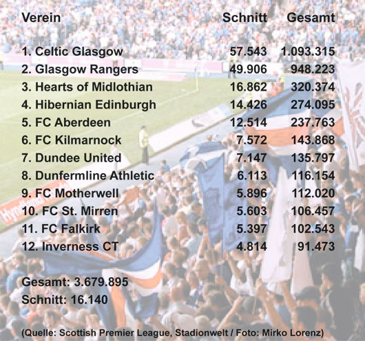 Die schottische Premier League lässt sich in Sachen Zuschauerinteresse getrost als Dreiklassengesellschaft betiteln. Celtic und die Rangers dominieren die Liga, haben im Schnitt dreimal so viele Zuschauer wie die drittplatzierten Hearts.