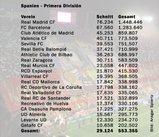 Real Madrid war in der vergangenen Saison das Maß aller Dinge in der spanischen Primera División. Neben dem Titelgewinn sicherte sich das Team von Trainer Bernd Schuster auch den ersten Platz in der Zuschauerwertung. Der Schnitt lag bei über 76.000 Fans.