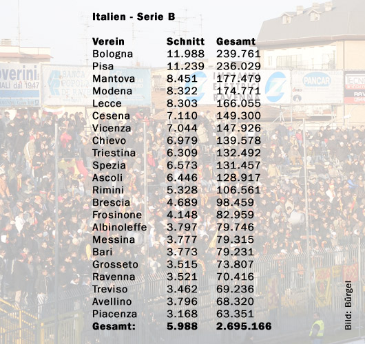 Angeführt wird die Zuschauerrangliste vom FC Bologna. Der Aufsteiger begrüßte in der vergangenen Saison insgesamt circa 240.000 Besucher im Stadion, was einen Durchschnittswert von ungefähr 12.000 Fans bedeutet. Fast gleichauf auf Rang zwei liegt Pisa Calcio . 11.300 Zuschauer sahen die Spiele unweit des Schiefen Turms durchschnittlich.