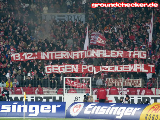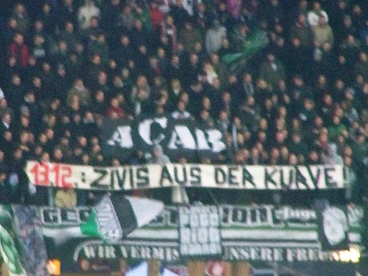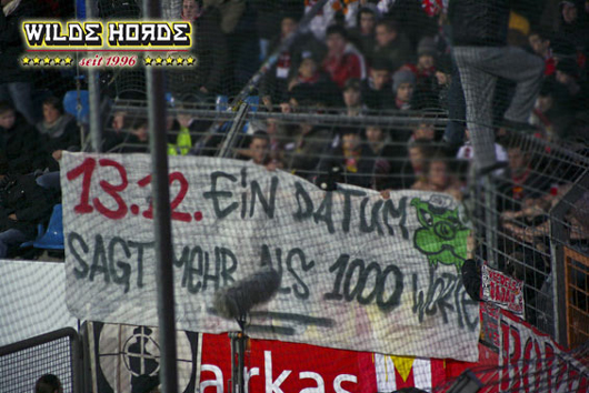 Am Samstag, den 13. 12 haben gleich mehrere Szenen Spruchbändern oder Choreos gemacht, die das Datum enthielten. Der Schriftzug steht auch als Verschlüsselung für ACAB, das ausgeschrieben „All Cops are Bastards“ bedeutet.
