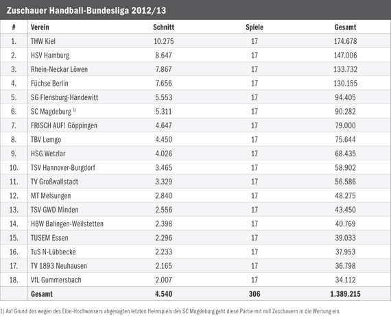 Wenig überraschend zog der THW Kiel erneut die meisten Zuschauer an, die Sparkassen-Arena war immer ausverkauft (10.275 Besucher). Damit eroberten die Zebras die Spitzenposition, die nach Jahren in der letzten Saison an den HSV Hamburg ging, wieder zurück. Der Champions-League-Sieger musste nämlich Einbußen von durchschnittlich 1.700 Fans hinnehmen. Auch die Rhein-Neckar Löwen eroberten ihren dritten Platz in dieser Saison zurück und konnten die Füchse Berlin hinter sich lassen.