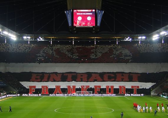 Die Ultras Frankfurt nutzten das Abendspiel gegen Schalke 04 und zeigten eine große Choreografie mit aufwendige Lichteffekten und dem Einsatz von Pyrotechnik in geschlossenen 3D-Buchstaben. Die Ultras Frankfurt zeigten damit eine völlig neue Art von Choreografie.