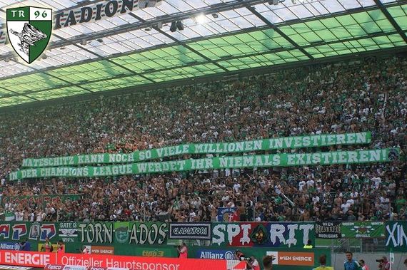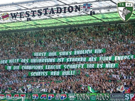 „Herst Didi, sieh's endlich ein: Der Wille des Universums ist stärker als eure Energy, in die Champions League schafft ihr es nie!“, war auf einem Spruchband der Ultras Rapid zu lesen. Auf einem weiteren Plakat im Block West stand „Mateschitz kann noch so viele Millionen investieren, in der Champions League werdet ihr niemals existieren!“ geschrieben.