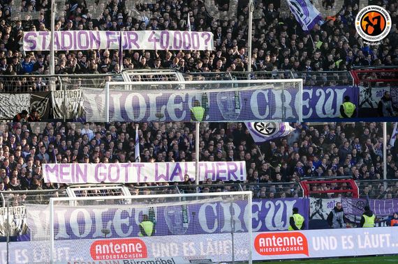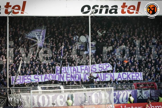 Auf der Osnabrücker Seite thematisierten die Spruchbänder vor allem die Stadionneubaupläne in Münster. „Brutalfans SCP: Neues Stadion endlich auf'n Acker!“ und „Stadion für 40.000? Mein Gott, Walther!“, stand auf Plakaten in der Ostkurve geschrieben, die die Pläne von Walther Seinsch thematisierten.