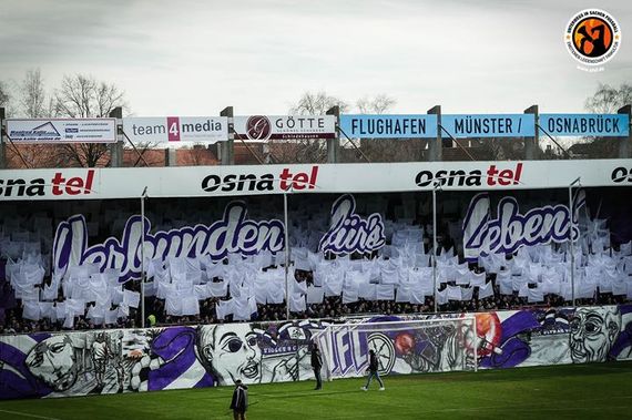 „Verbunden für's Leben!“, lautete das Motto der Choreografie der Osnabrücker Ultras, die vor allem durch ein detailliert gemalte Plane ins Auge fiel. Dazu wurden weiße und violette Doppelhalter präsentiert und das Motto der Kurvenshow an Stangen hochgehalten.