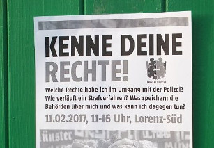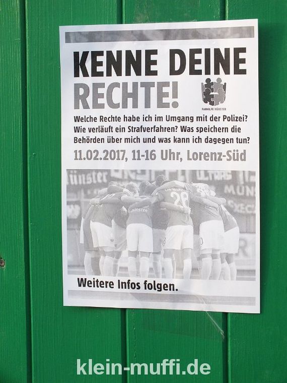 Zunächst hielt eine Anwältin einen Vortrag über das Strafverfahren und die Rechte und Pflichten bei Personalienfeststellung, Ingewahrsamnahme, ED-Behandlung oder Hausdurchsuchungen. Außerdem wurde über die unterschiedlichen Datenbanken auf Länder- und Bundesebene informiert, besonders die Datei Gewalttäter Sport und die SKB-Datenbank in Münster wurde beleuchtet. Des Weiteren wurden Tipps zu Datenauskunftsersuchen bei den zuständigen Behörden geliefert, ehe zum Abschluss der Veranstaltung die anwesenden Anwälte in einer offenen Fragerunde Rede und Antwort standen. Die Veranstaltung im Stadtteilhaus Lorenz-Süd in Münster dauerte rund fünf Stunden. (Faszination Fankurve, 15.01.2017)