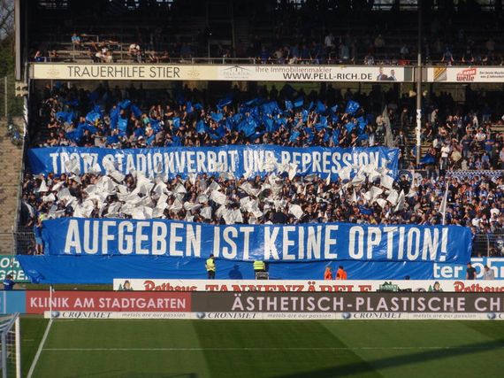 Ultras des Karlsruher SC haben im Abstiegskampf das Motto „Aufgeben ist keine Option!“ ausgerufen und verschiedenste Aktionen, wie Trainingsbesuche oder ein Fahnenmeer in Nürnberg organisiert. Beim gestrigen Heimspiel des KSC gegen die Würzburger Kickers kam eine Choreografie hinzu.
