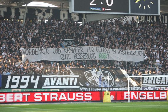 Die Pyroaktion zum zehnten SWS-Geburstag war nicht die einzige Pyroshow der Sturm Graz Fans, die noch mehrmals Pyro zündeten. Via Spruchband machten sich die Sturm Ultras noch über die Austria Wien Fans lustig: „Die Choreo vorab im Internet präsentiert – Kein Wunder, dass sich ganz Österreich für euch Schweine geniert!“, war darauf zu lesen. Mit dem Plakat „Vordenker und Kämpfer für Ultras in Österreich – Gute Besserung Koby!“ wünschten die Ultras von Sturm Graz trotz aller Rivalität einem Gründungsmitglied der Ultras Rapid gute Besserung, dem wegen seiner Zuckerkrankheit zuletzt ein Bein unterhalb des Knies amputiert werden musste. Die mitgereisten Fans von Austria Wien zeigten gestern zudem eine „Anti-Graz“-Zettelchoreografie. (Faszination Fankurve, 16.10.2017)