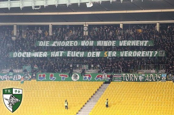 Doch zurück zum Pokalderby am Mittwoch: Das Spruchband „Die Choreo vom Winde verweht. Doch wer hat euch den 5er verdreht?“ spielte ebenfalls auf das Derby am vergangenen Sonntag an. Genaugenommen auf die dort von den Viola Fanatics nachgeholte Choreografie zum 15. Geburtstag (Faszination Fankurve berichtete). Der Doppelhalter mit der Zahl 5 beim „15 Jahre Viola Fanatics“-Schriftzug war dabei falsch herum hochgehalten worden, worauf das Plakat der Ultras Rapid anspielte. Bei einer anderen geplanten Choreografie der FAK-Fans Mitte September beim Europa League Heimspiel gegen den AC Mailand machte ein Unwetter den Planungen der Austria Wien Fans einen Strich durch die Planungen (Faszination Fankurve berichtete).