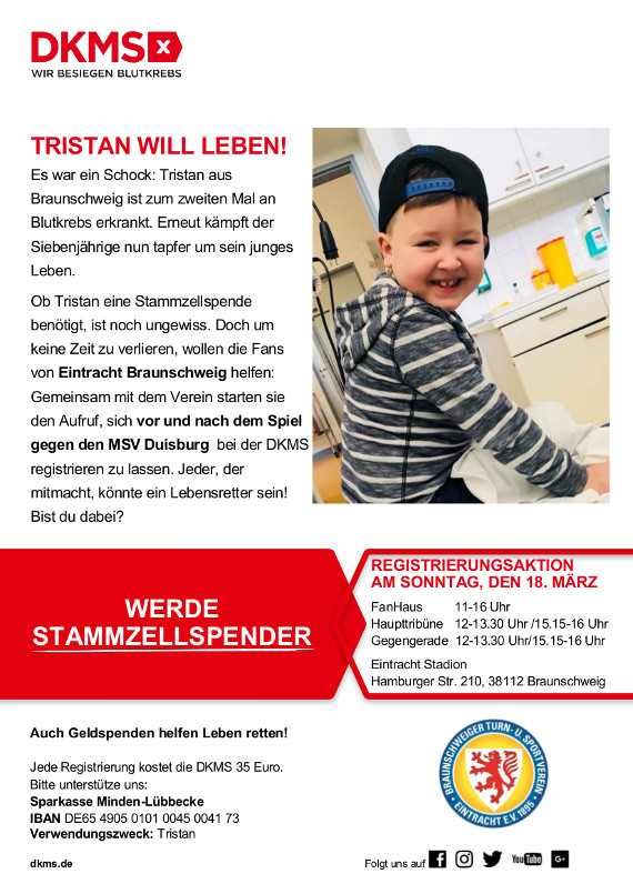 Wenn Eintracht Braunschweig am 18. März 2018 den MSV Duisburg zum Heimspiel im Eintracht-Stadion empfängt, organisiert die Braunschweiger Fanszene eine große Typisierungsaktion, um einen Spender für den kleinen Tristan zu finden, der erneut an Leukämie erkrankt ist und schon seit Jahren von der Fanszene unterstützt wird.