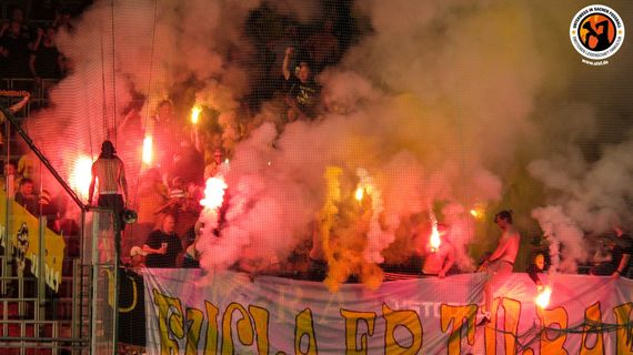 Im Gästeblock wurde hingegen eine Blockfahne mit Lillestrøm SK-Wappen hochgezogen und Pyrotechnik in Form von Bengalischen Fackeln und Rauch gezündet. Dazu wurde ein Spruchband mit der Aufschrif „Fugla er tilbake!“ (Die Vögel sind zurück!) gezeigt. Auch die LASK-Fanszene, die gestern Freunde von den Young Boys Bern zu Gast hatte, zeigte später noch eine große Pyroshow.