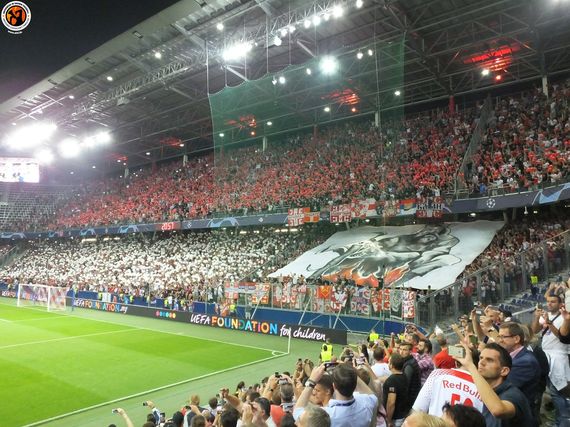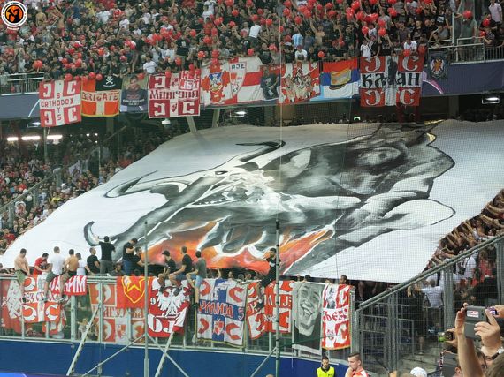 Die fünfstellige Anzahl an Roter Stern Belgrad-Fans, die in der Arena in Wals-Siezenheim eine ganze Hintertortribüne füllten, konnte somit den ersten Einzug von Roter Stern Belgrad in die Gruppenphase der Champions League feiern. Zum Intro zeigten die Gästefans unter den insgesamt 26.500 Zuschauern noch eine Luftballon-Choreografie mit roten Ballons im Oberrang und weißen Luftballons im Unterrang. Dazu wurde im eigentlichen Gästeblock noch eine Blockfahne hochgezogen. Nach Abpfiff stürmten einige Gästefans auf den Rasen, um die eigenen Spieler zu feiern. (Faszination Fankurve, 30.08.2018)