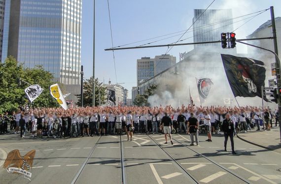 „Getreu dem Motto 'Glorreiche Zeiten – Traurige Tage' sind wir schon das eine oder andere mal zu besonderen Anlässen aus dem Herzen unserer Stadt Richtung Stadion gezogen, allerdings noch nie als Pokalsieger. Könnte es also einen besseren Moment geben als jetzt, vor dem ersten Heimspiel der kommenden Saison? Eintracht-Fanatiker aller Couleur: Lasst uns unserer geliebten Stadt zeigen, dass mit Eintracht Frankfurt und seinen Fans dieses Jahr wieder zu rechnen ist!“, hieß es vor dem Spiel im Aufruf der Ultras Frankfurt für den Fanmarsch (Faszination Fankurve berichtete). Tausende Eintracht-Fans folgten diesem Aufruf und zogen gestern vom Römer aus in Richtung Waldstadion. Die meisten Eintracht-Fans hatten dabei die weißen T-Shirts an, die beim Pokalfinale 2018 alle Eintracht-Fans in der Ostkurve des Olympiastadions von den Ultras erhielten.