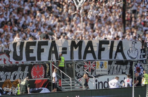 Weil die UEFA den kommenden Europa League-Gegner Olympique Marseille u.a. zu einem Geisterspiel verurteilte, zeigten Frankfurter Ultras gestern ein „UEFA=Mafia“-Plakat. Wegen der Verbandsstrafe dürfen beim ersten Europapokal-Spiel der Eintracht in diesem Jahr auch keine Frankfurter Fans ins Stadion (Faszination Fankurve berichtete).