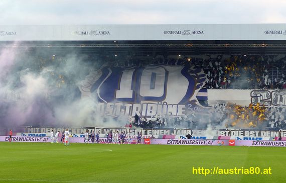 Am vergangenen Sonntag spielten Austria Wien und Sturm Graz im Franz-Horr-Stadion gegeneinander. Die Ultras von Austria Wien zeigten anlässlich des zehnten Geburtstags der Osttribüne eine Choreografie und die Gäste aus Graz zündeten bei ihrer „BACK IN BLACK“-Tour Pyro.