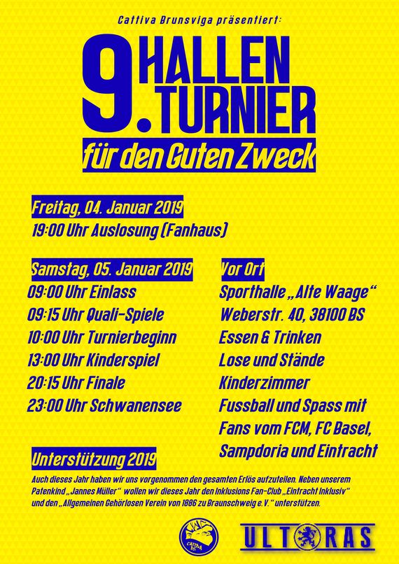 Am 05.01.2019 findet ab 10:00 Uhr in der Sporthalle Alte Wage (Weberstr. 40, 38100 BS) das mittlerweile 9. „Cattiva Hallenturnier für den guten Zweck“ statt, dass im Blau-Gelben Volksmund liebevoll „Jannesturnier“ genannt wird. Dieses Jahr treten 22 Fanmannschaft, darunter jeweils eine mit befreundeten Fans des FC Basel und von Sampdoria Genua, um den begehrten Wanderpokal an. „Sämtliche Spendenerlöse werden auch dieses Jahr wieder vollumfänglich karitativ gespendet“ so Benny Riefenberg, Vorsänger der Ultras von Cattiva.