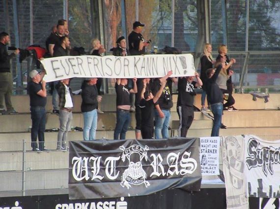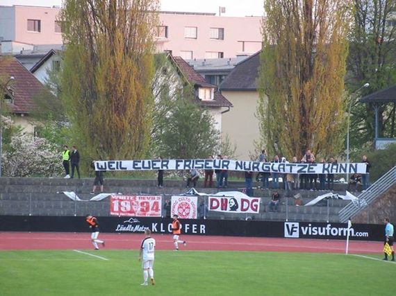 Auf ein „Weil euer Friseur nur Glatze kann“-Spruchband im Gästeblock folgte ein „Euer Frisör kann nix!“-Plakat der Heimfans und auf den „Heut kickln wir euch weg wuff oink rulps“-Spruch der Dornbirn-Fans antworteten die Bregenzer mit einem „Wann + Wo: Dornbirner Rülpser Spruchbänder zum Kotzen“