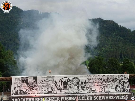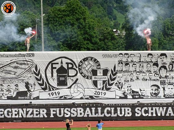 Mit dem Vereinsjubiläum wurde an die Gründung des FC Bregenz mit schwarz-weißen Vereinsfarben am 28. Juni 1919 erinnert. 1945 wurde der Verein in Schwarz-Weiß Bregenz umbenannt. Bevor der Verein 2005 Konkurs ging und 2007 aufgelöst wurde, spielte der Club unter mehreren Sponsoren- und Fusionsnamen. Schon 2005 gingen die Jugendmannschaften im SC Bregenz auf. Aus diesem Verein wurde 2013 wieder Schwarz-Weiß Bregenz. Am Samstag kam es vorm Heimspiel in der Vorarlbergliga noch zu einem Legendenspiel der ehemaligen Bundesliga-Spieler von Schwarz-Weiß Bregenz und von Austria Lustenau. (Faszination Fankurve, 18.06.2019)