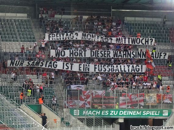Die Red Bull Salzburg-Anhänger protestierten im Gästeblock des Weststadions hingegen mit einem „Freitag? Montag? Mittwoch? Wo hört dieser Wahnsinn auf? Nur Samstag ist ein Fußballtag!“-Spruchband gegen die Spieltagszerstückelung in Österreich, wo Fanproteste auch gegen am Sonntag ausgetragene Partien zunehmen. Zuletzt hatten viele österreichische Fanszenen den Dialog mit dem ÖFB und der Bundesliga abgebrochen, auch wegen der fanunfreundlichen Anstoßzeiten (Faszination Fankurve berichtete). Die Anhänger von Red Bull Salzburg waren kein Teil der Fanszenen, die dieses Statement unterzeichneten. Der amtierende Meister gewann das Auswärtsspiel bei Rapid am gestrigen Freitagabend mit 2:0. Im Block West wurde bei dem Spiel mehrfach Pyrotechnik in Form von Bengalischen Fackeln und grünem Rauch gezündet. Die Fanfotos des Spiels gibt es oben in der Galerie. (Faszination Fankurve, 27.07.2019)