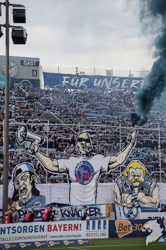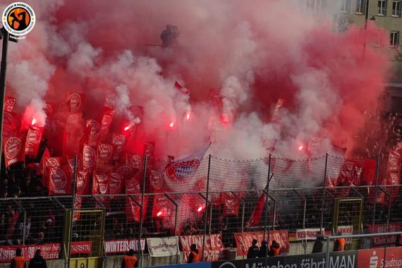 Da der TSV 1860 München gestern Heimrecht hatte, mussten die FC Bayern-Fans mit dem Gästeblock im Grünwalder Stadion vorliebnehmen. Dort zeigten die FC Bayern-Fans beim Einlaufen der Mannschaften ein Intro aus Doppelhaltern mit dem Vereinswappen, auf dem „FC Bayern Amateure“ geschrieben stand. Zusätzlich wurden die Doppelhalter mit einem „Giesing“-Schriftzug versehen, weil die FC Bayern-Amateure in dem Stadtteil ihre Heimspiele austragen, in dem der Lokalrivale beheimatet ist. Abgerundet wurde die Aktion der Gästefans mit Rauch und Bengalischen Fackeln in den Vereinsfarben des FC Bayern.
