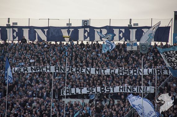 Zu Beginn der zweiten Halbzeit hing vor der Westkurve der Löwenfans noch eine große „Gegen alle Betretungsverbote!“-Botschaft und mit einem „Wer nach anderen mit Gläsern wirft, fällt selbst hinein!“-Spruchband wurde den FC Bayern-Fans vorgeworfen, bei einer Auseinandersetzung zwischen beiden Fanlagern vor ein paar Wochen Gläser geworfen zu haben.