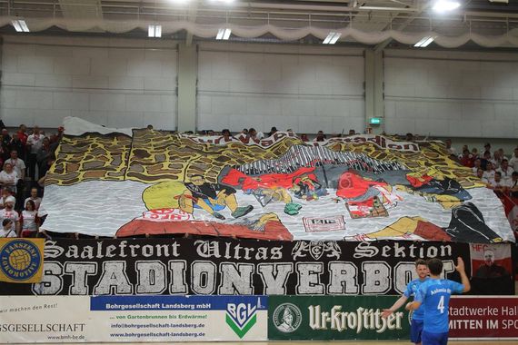 Hinter der „Sektion Stadionverbot“-Zaunfahne der Saalefront Ultras wurde eine Blockfahne hochgezogen, auf der mit Stadionverboten belegte HFC-Fans vor den verschlossenen Toren des Kurt-Wabbel-Stadions zu sehen waren, während im Inneren des Stadions eine gefüllte HFC-Fankurve abgebildet waren. Anschließend ging die Blockfahne herunter und in der Halle kam ein Meer aus HFC-Fahnen zum Vorschein. Dazu sangen die HFC-Fans den „Gute Freunde kann niemand trennen“-Song von Franz Beckenbauer.
