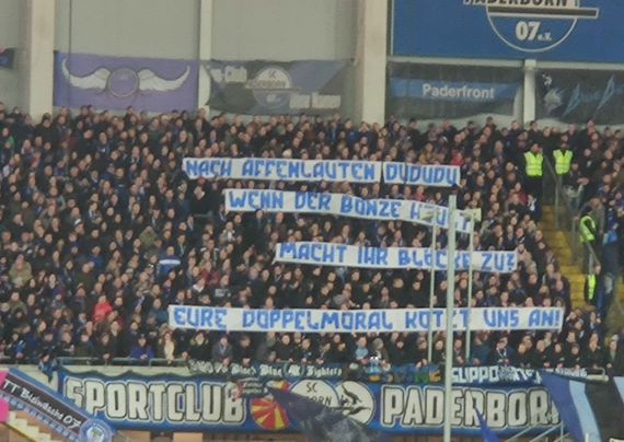 Am Freitagabend zeigten die SC Paderborn auch zwei Spruchbänder zum Thema, auf denen „Nach Affenlauten du du du, wenn der Bonze heult macht ihr Blöcke zu? Eure Doppelmoral kotzt uns an!“ und „Beleidigung Wendler egal! Beleidigung Hopp Skandal!“ geschrieben stand. Im Gästeblock war noch eine „Fick dich DFB!“-Botschaft sowie ein DFB-Logo im Fadenkreuz zu sehen. Gemeinsam stimmten beide Fanszenen noch einen Wechselgesang.