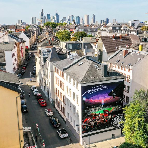 Das neue Wandbild mit der Skyline von Frankfurt im Hintergrund.
