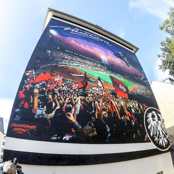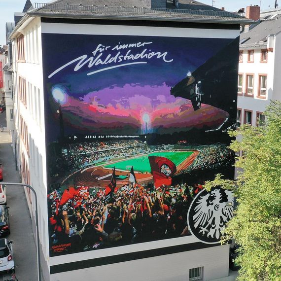 Bevor Eintracht Frankfurt am Samstag erstmals im erneut umbenannten Waldstadion auflief, war im Stadtteil Bornheim ein neues Wandbild zu bestaunen, mit dem an das alte Waldstadion erinnert wird. Das Künstlerkollektiv „Frankfurter Farbe“ hat vorm Saisonstart dieses neue Werk fertiggestellt.