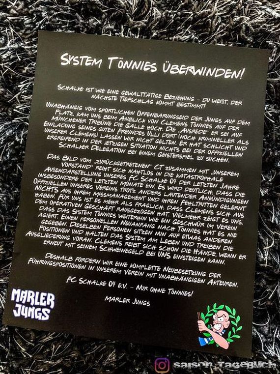 Die Marler Jungs befürchten, dass Tönnies ins Zukunft als Investor auf Schalke einsteigen könnte, schließlich wird beim FC Schalke 04 aktuell eine Ausgliederung der Profimannschaft in eine Kapitalgesellschaft diskutiert: „Vielmehr zeigt es uns, dass das System Tönnies weiterhin wie ein Geschwür im Verein agiert. Einen personellen Neuanfang nach Tönnies hat es nie gegeben. Die selben Personen sitzen nun auf etwas anderen Positionen und halten das System am leben und treiben die Ausgliederung voran. Clemens reibt sich schon die Hände, wenn er erneut mit seinem Schweinegeld bei uns einsteigen kann. Deshalb fordern wir eine komplette Neubesetzung der Führungspositionen in unserem Verein mit unabhängigen Akteuren. FC Schalke 04 e.V. – Nur ohne Tönnies!“, so die Stellungnahme der Marler Jungs weiter. (Faszination Fankurve, 19.10.2020)