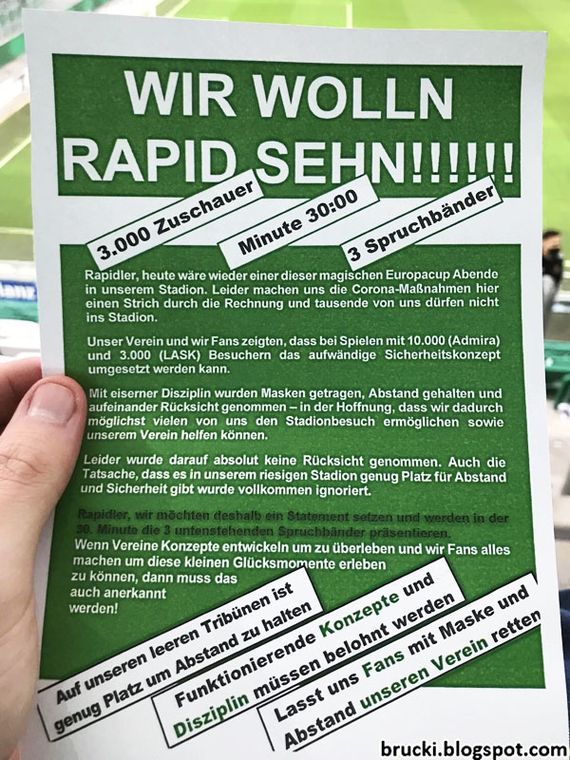 In der 30. Minute zeigten Rapid-Fans ein dreiteiliges Spruchband um gegen die erneute Reduzierung der erlaubten Zuschauerzahlen in Österreich zu protestieren. „Auf unseren leeren Tribünen ist genug Platz, um Abstand zu halten / Funktionierende Konzepte und Disziplin müssen belohnt werden / Lasst uns Fans mit Maske und Abstand unseren Verein retten“ war darauf zu lesen. Die Forderungen dieser Gruppe von Rapid-Fans wurden auf verteilten Flyern nochmal untermauert.