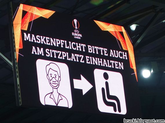 Anders als in der Liga ist im Europapokal das Tragen von Mund-Nasen-Schützern auch auf den Plätzen vorgeschrieben und nicht nur auf den Wegen dorthin, weshalb die Rapid-Fans die Masken gestern durchgehend tragen mussten.
