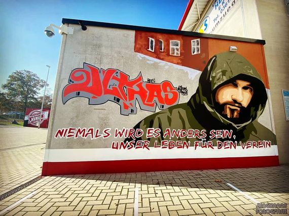 Der Spielbetrieb der Oberliga NOFV-Süd wurde im Rahmen des zweiten Lockdowns vorübergehend eingestellt, weshalb der FC Rot-Weiß Erfurt aktuell pausiert. Ultras von RWE waren trotzdem im Steigerwaldstadion aktiv und haben dort graue Wände mit Wandbildern in den Vereinsfarben bemalt.