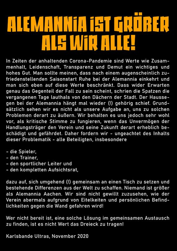Bereits am 09. November rief die Ultragruppe, die in diesem Jahr ein Jahrzehnt alt geworden ist, unter der Überschrift „Alemannia ist größer als wir alle!“ zu mehr Ruhe im Verein auf: „In Zeiten der anhaltenden Corona-Pandemie sind Werte wie Zusammenhalt, Leidenschaft, Transparenz und Demut ein wichtiges und hohes Gut. Man sollte meinen, dass nach einem augenscheinlich zufriedenstellenden Saisonstart Ruhe bei der Alemannia einkehrt und man sich eben auf diese Werte beschränkt. Dass wider Erwarten genau das Gegenteil der Fall zu sein scheint, schrien die Spatzen die vergangenen Tage lauthals von den Dächern der Stadt. Der Haussegen bei Alemannia hängt mal wieder (!) gehörig schief. Grundsätzlich sehen wir es nicht als unsere Aufgabe an, uns zu solchen Problemen derart zu äußern. Wir behalten es uns jedoch sehr wohl vor, als kritische Stimme zu fungieren, wenn das Unvermögen der Handlungsträger den Verein und seine Zukunft derart erheblich beschädigt und gefährdet. Daher fordern wir – ungeachtet des Inhalts dieser Problematik – alle Beteiligten, insbesondere die Spieler, den Trainer, den sportlichen Leiter und den kompletten Aufsichtsrat dazu auf, sich umgehend (!) gemeinsam an einen Tisch zu setzen und bestehende Differenzen aus der Welt zu schaffen. Niemand ist größer als Alemannia Aachen. Wir sind nicht gewillt zuzusehen, wie der Verein abermals aufgrund von Eitelkeiten und persönlichen Befindlichkeiten gegen die Wand gefahren wird! Wer nicht bereit ist, eine solche Lösung im gemeinsamen Austausch zu finden, ist nicht Wert das Dreieck zu tragen!“, so die deutlichen Worte der Karlsbande Ultras. (Faszination Fankurve, 19.11.2020)