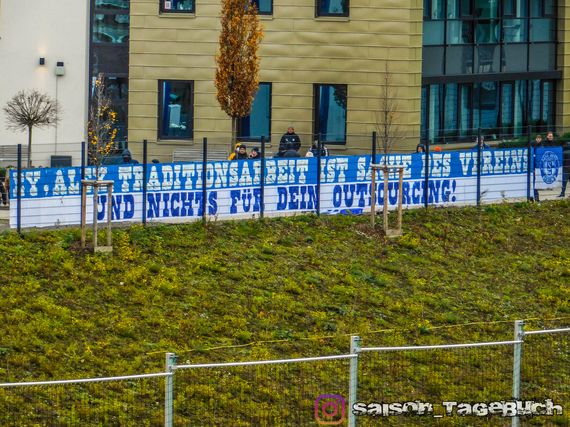 Bereits am vergangenen Wochenende hatte die Gruppe Blue Boyz auf Schalke Spruchbänder aufgehangen, auf den „Unser Verein steht für die Menschen, die ihn leben, und nicht für menschenfremde Unternehmenskultur!“ und „Ey, Alex, Traditionsarbeit ist Sache des Vereins und nichts für dein Outsourcing!“ geschrieben stand.