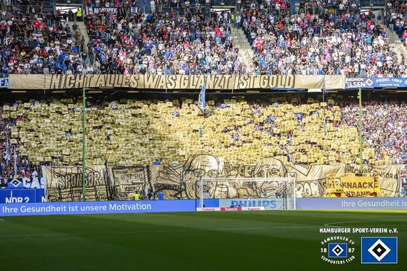 Choreografie auf der Nordtribüne Hamburg mit Kritik an Investoren, wie Klaus-Michael Kühne und Dietrich Mateschitz.