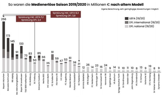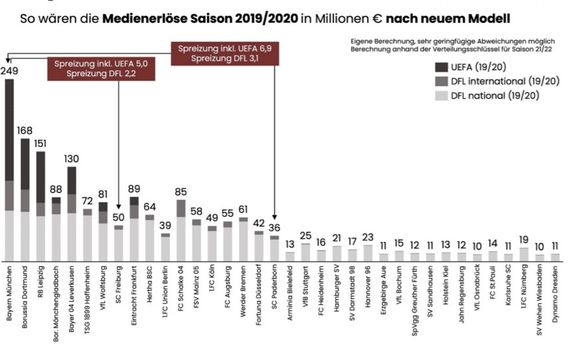Bei gemeinsamer Betrachtung der nationalen und internationalen Erlöse wird klar, dass auch zukünftig deutlich über 50% der Einnahmen nach Leistungskriterien verteilt werden, wobei der vergangene sportliche Erfolg auch künftig über 90% der Leistungskriterien ausmacht. Das Leistungsprinzip anzuwenden ohne zu berücksichtigen, unter welchen Voraussetzungen und unter Aufwendung welcher Mittel die Leistung zustande gekommen ist, befördert weiterhin Finanzdoping und Misswirtschaft. Die minimale Erhöhung der Nachwuchssäule ist zwar ein richtiger Schritt, ob dieses 1% wirklich einen Anreiz zur Stärkung darstellt, darf jedoch bezweifelt werden. In der Saison 2019/2020 wurden etwa 24 Millionen Euro über diesen Topf ausgeschüttet, 2021/2022 werden es 32 Millionen Euro sein, dies entspricht etwa 200.000€ pro Verein. Vor allem wurde die große Chance verpasst, weitere zukunftssichernde Leistungskriterien einzuführen. Mit der Effizienzquote lag hier zumindest ein geeigneter Vorschlag auf dem Tisch. Stattdessen bleibt das selbstgeschaffene Belohnungssystem, in dem sportlich erfolgreiche Vereine mehrfach profitieren, auch zukünftig bestehen.