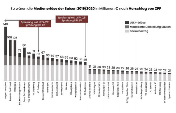 Die Verteilung der Medienerlöse für die letzte Saison nach dem Modell-Vorschlag von Zukunft Profifußball.