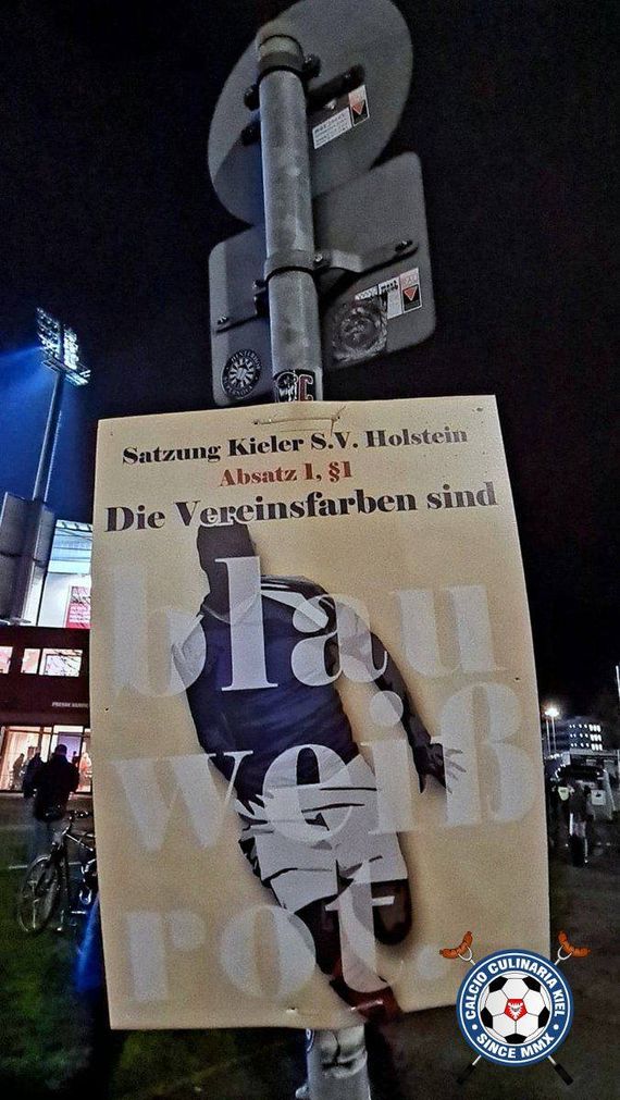 Die Kieler Fanszene griff das Thema gestern nochmals auf und platzierte Plakate im Umfeld des Holstein-Stadions, mit denen auf Paragraph 1, Absatz 1 der Vereinssatzung hingewiesen wurde, in dem „Die Vereinsfarben sind blau-weiß-rot“ geschrieben steht.
