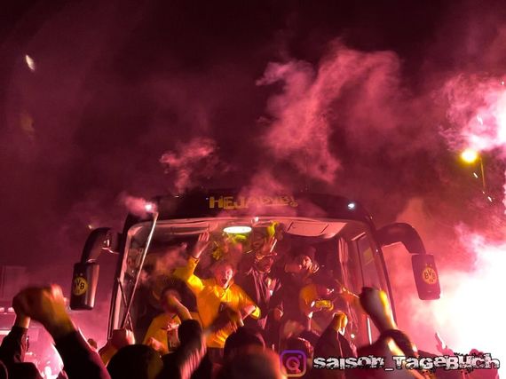 Nachdem der BVB am Samstagabend das 180. Revierderby auf Schalke mit 4:0 gewann, nahmen zahlreiche Dortmund-Fans die eigene Mannschaft am Trainingsgelände des BVB mit Gesängen, Pyrotechnik und Feuerwerk in Empfang (Faszination Fankurve berichtete).
