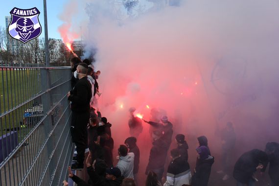 Beim Trainingsbesuch der etwa 300 FAK-Fans des Ostblocks wurde auch am Trainingsplatz Pyrotechnik eingesetzt und die Mannschaft mit Gesängen auf das anstehende Derby eingeschworen. Am Ende positionierten sich die FAK-Spieler noch hinterm „immer weiter – stets voran“-Banner, das schon beim Motivationsbesuch vorm Heimspiel gegen den SCR Altach zum Einsatz kam (Faszination Fankurve berichtete). (Faszination Fankurve, 07.03.2021)