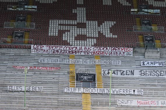 „Zusammen mit dem Fanbeirat, dem Fanbündnis und Fanprojekt Kaiserslautern hat der FCK nun entschieden, allen FCK-Fanclubs die Möglichkeit zu geben, motivierende Spruchbänder anzufertigen, die vor dem Heimspiel gegen den Halleschen FC in der Westkurve aufgehangen werden. So könnt ihr auch in Zeiten der Geisterspiele noch einmal ein paar Worte an die Mannschaft richten und ein optisches Zeichen setzen“, hieß es im Vorfeld der Aktion in Kaiserslautern (Faszination Fankurve berichtete).