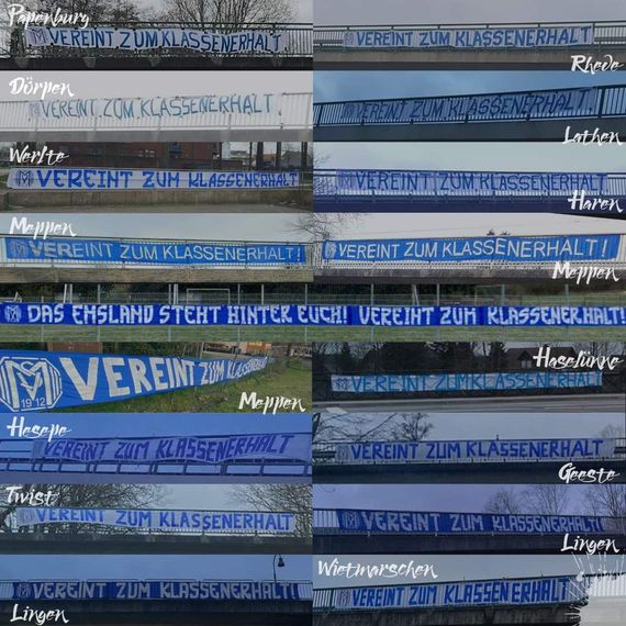 Die Plakate der SVM-Fans hingen in Papenburg, Rhede, Dörpen, Lathen, Werlte, Haren, Haselünne, Hesepe, Geeste, Twist, Lingen und natürlich in Meppen. Dort war neben dem „Vereint zum Klassenerhalt“-Spruch auch eine „Das Emsland steht hinter euch!“-Botschaft zu lesen.