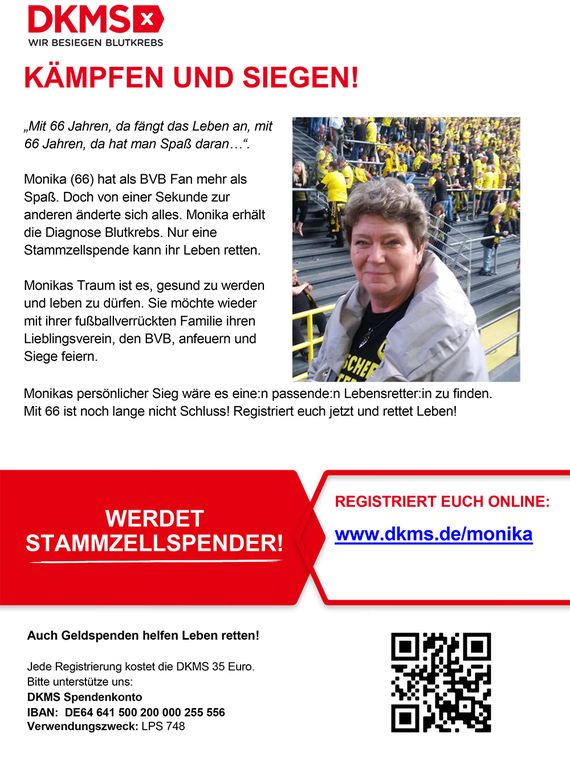 „BVB-Fan Monika hat die erschütternde Diagnose Leukämie erhalten und benötigt dringend eine Stammzellspende, um den Kampf gegen den Krebs zu gewinnen. Mit wenig Aufwand kann sich jeder von Zuhause bei der DKMS registrieren und so als potenzielle*r Spender*in Leben retten. Ihr findet alle nötigen Informationen unter dem folgenden Link: https://www.dkms.de/monika Bitte nehmt Euch die Zeit und helft Monika bei der Suche nach der lebenswichtigen Spende!“, heißt es fast wortgleich in den Aufrufen vom Südtribüne Dortmund-Zusammenschluss, dem Online-Fanzine Schwatzgelb.de und der BVB-Fanabteilung. Unabhängig von der Vereinszugehörigkeit könnt ihr euch bei der DKMS registrieren und so möglicherweise Leben retten. Macht mit! (Faszination Fankurve, 28.04.2021)