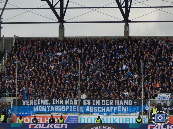 Spruchband von HSV-Fans zum Thema Montagsspiele beim Auswärtsspiel in Ingolstadt.
