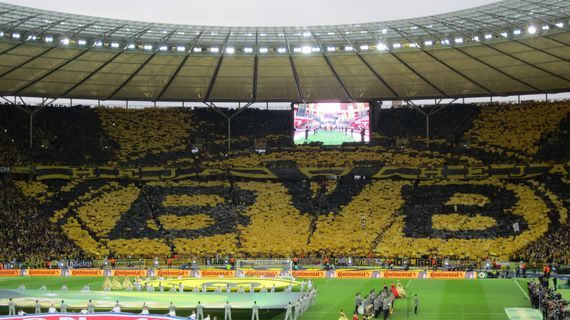 Wir zeigen Final-Choreografien, Stimmungsbilder und Pyroaktionen von Bayern München,- Borussia Dortmund-, FC Schalke 04-, Union Berlin-, MSV Duisburg-, 1. FC Nürnberg-, Eintracht Frankfurt-, VfB Stuttgart-, Werder Bremen-, 1. FC Kaiserslautern-, Alemannia Aachen- und Bayer Leverkusen-Fans. Auf solche Bilder müssen wir heute verzichten. Statt Choreografien und Emotionen gibt es heute im Olympiastadion lediglich von Borussia Dortmund platzierte Folien zu sehen, die leere Sitzschalen verdecken und an die Pokalerfolge des BVB erinnern sollen. Noch in Dortmund platzierten BVB-Ultras ein „Holt dat Ding na Doatmund!“- Spruchband und erinnerten damit ein eine vergangene Aktion der BVB-Fans.